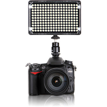 The Amaran AL-H198 from Aputure is an on-camera LED light that utilizes 198 LEDs with a CRI of 95+ to deliver daylight illumination with high color accuracy. The light produces a 60° beam angle with a brightness of 920 lux at a distance of 3.3′. A step-less dimming dial is provided on the back of the unit for adjusting light output from 0 to 100%. The light can be powered by either six AA batteries or an optional Sony NP-F/FM/QM/FP/FH/FV type battery, with four LED indicator lights on the back of the unit displaying the remaining battery life. To create a larger light source, up to nine AL-H198 panels can be attached together using extension slots on all four sides of the light. The slim and frameless design of the light means that when multiple light are connected, there are no gaps or light leaks. One extension attachment piece comes included, which also serves as a 1/4″-20 adapter. Also included are a swivel shoe-mount adapter for camera-mounting, a diffusion filter, and an orange warming filter. Learn more