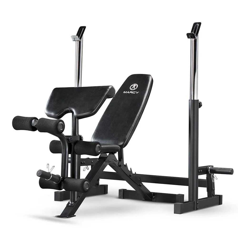 The Marcy Deluxe Olympic Bench W/ Squat Stand is an extremely versatile workout bench that has space to work out your chest, shoulders, biceps, legs, and more. With an adjustable preacher curl pad to bulk up your arms, dual-function leg developer to work out your legs, and an adjustable 4-position back pad, this weight lifting bench can work all of your major muscle groups. The multipurpose design of the Marcy Deluxe Olympic Bench W/ Squat Stand makes this a great addition to any home gym.