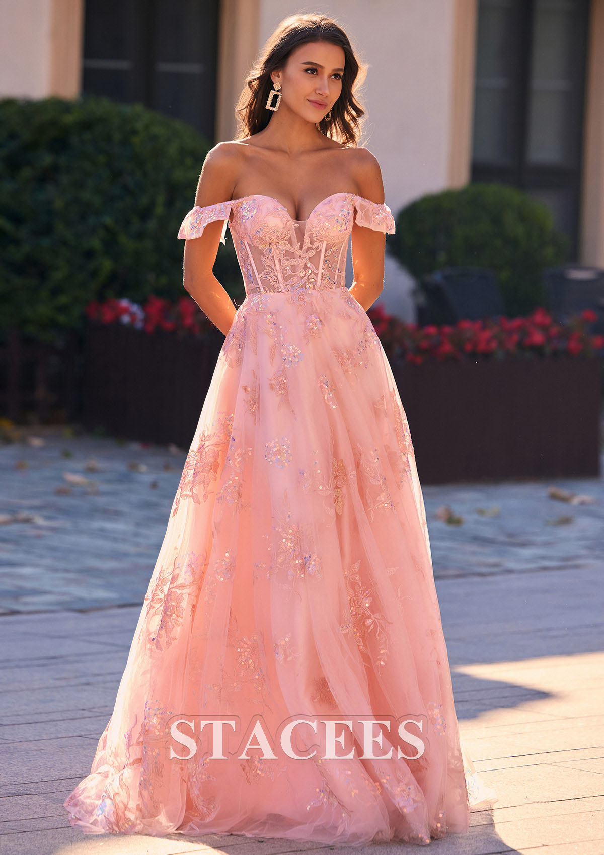 Off Shoulder Salmon Pink A Line Tulle Dress For Rent